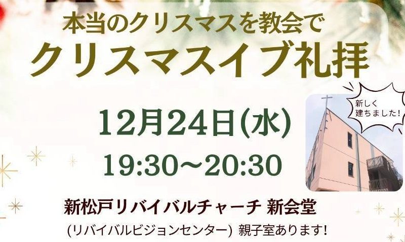 クリスマス・イブ礼拝 2023 | 新松戸リバイバルチャーチ... 11月 12, 2023 wpmaster クリスマス・イブ礼拝 本当のクリスマスを教会で… クリスマス・イブの夜を教会で過ごしてみませんか? どなたでも […]...
