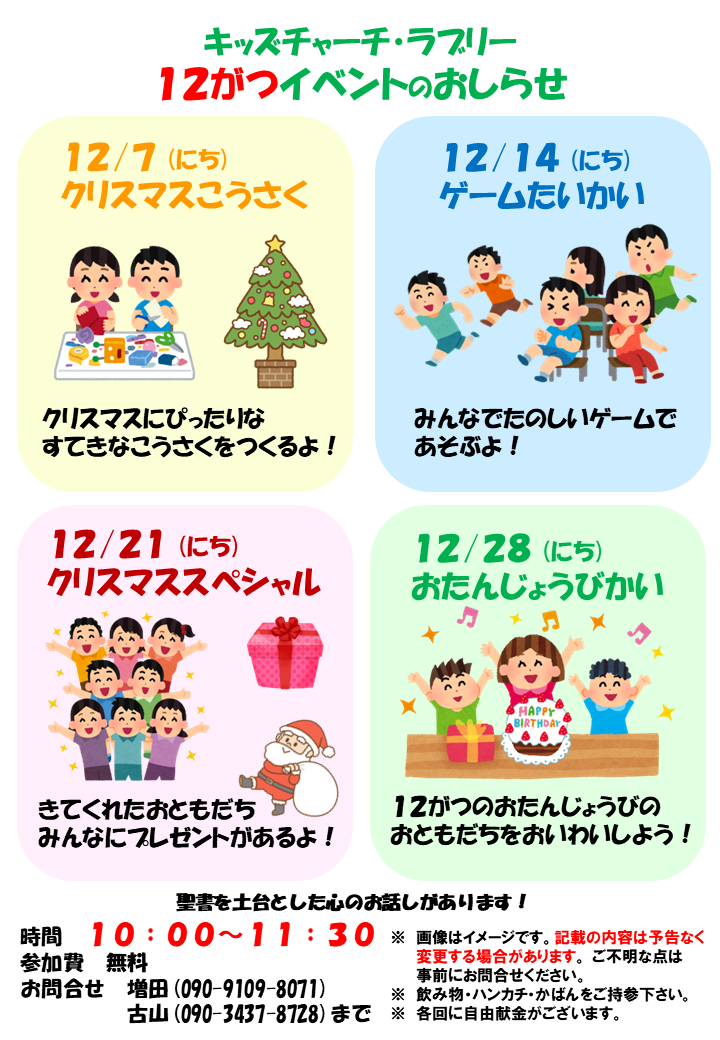 キッズチャーチ(小学生) キッズチャーチ(教会学校) キッズチャーチとは 新松戸リバイバルチャーチのオリジナルの教会学校で、幼児から小学生まで、たくさんの子どもたちが集まっています。楽しい歌やゲームをしながら、聖書に基づいた人格の養育を目指しています。 キッズチャーチの時間 キッズチャーチ(小学生) 日時 毎週日曜 10:00から11:45 場所 新松戸リバイバルチャーチ 1階、2階 キッズチャーチ・ラブリー(未就学児) 日時 毎週日曜 10:00から11:30 場所 ひかりの子幼児園 なお、当教会は、プロテスタントの教会です。エホバの証人(ものみの塔)、統一教会、モルモン教ではありません。このようなことでお困りの方は、ご相談ください。 その他活動 ダンスクラブ サッカークラブ